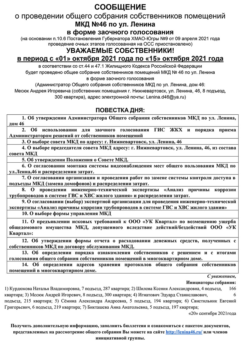 Обращаем Ваше внимание на то, что в период с «01» октября 2021 года по «15» октября 2021 года в нашем доме будет проходить общее собрание собственников в форме заочного голосования. Просим ознакомиться с повесткой собрания!
